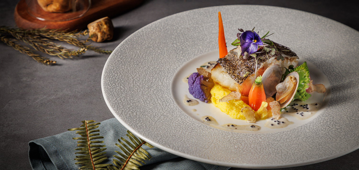 海鲜迷不能错过Andrea另一诚意之作—焗智利 鲈鱼、炒蚬肉、薯蓉、白松露鱼子酱汁。细腻 香嫩的智利海鲈鱼与白松露的香气相得益彰。 而丝滑的马铃薯泥为整道菜肴增添口感;最后更以鱼汤特制的白松露鱼子酱汁提鲜点缀,加 上片片新鲜即刨白松露,味道层次丰富。
