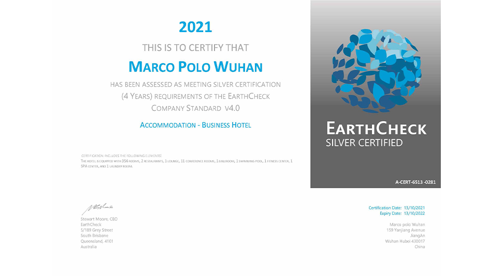 酒店总经理李荣辉先生表示:“作为对社会及自然环境担负责任的企业,依靠EarthCheck科学缜密的量化评测和解决方案实现负责任的环境管理目标。 武汉马哥孛罗酒店在2017年获得EarthCheck认证铜质认证, 在此基础上我们不断进取,于2021年连续4年获得银质认证。感谢EarthCheck对酒店在环境方面所做出的努力的认可。我们将继续用科学的办法积极减少能源和水的消耗量,争取下一阶段获得金质认证。”
